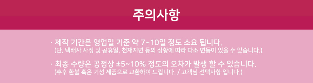 ※ 최종 수량은(제작 제품) 공정상 ±5~10% 정도의 오차가 발생 할 수 있으며, 추후 환불 혹은 기성 제품으로 교환하여 드립니다. (고객님 선택사항)
